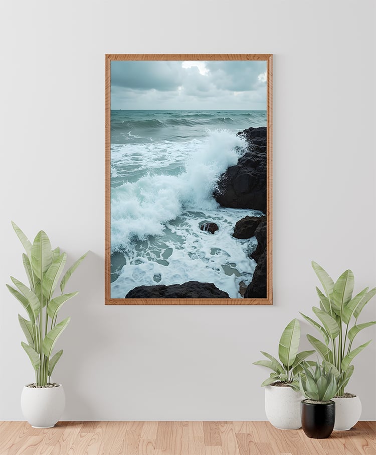 "Rocky Coastline Waves" captures the raw power and timeless beauty of the ocean meeting jagged cliffs. This dramatic seascape evokes nature’s resilience, the constant push and pull between land and sea, and the awe-inspiring force that shapes our world. It’s a tribute to the wild, untamed spirit of the coastline.