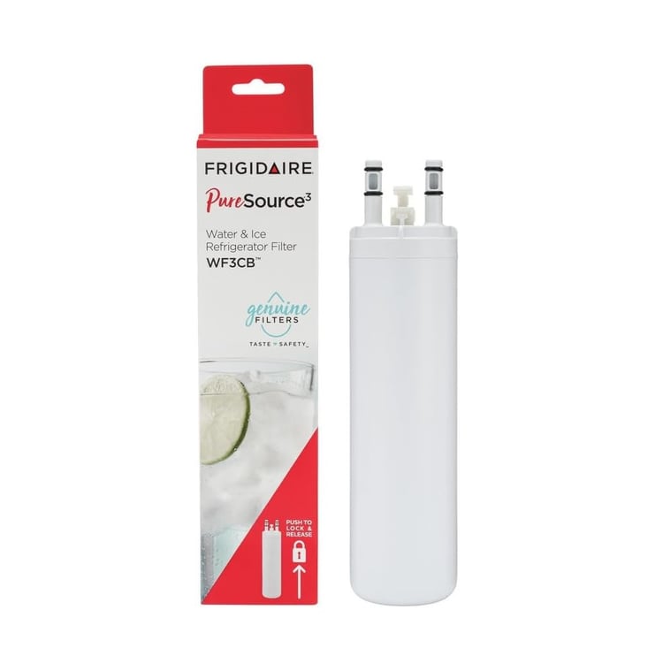 The genuine OEM Whirlpool / KitchenAid 4396841 Refrigerator Ice & Water Filter replacement fits Whirlpool, KitchenAid, Maytag, Amana, Jenn-Air, and Kenmore side-by-side refrigerators with a push-button filter located in the grille at the bottom of the fridge.